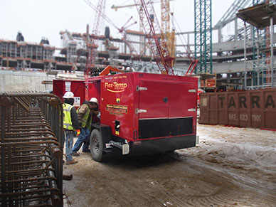 M. A. Mortenson Co. will not let a Minnesota winter dictate the progress of stadium construction. Instead they are utilizing Flex-Temp System’s, Fusion 3000 surface heating machines for thawing frozen ground for excavating and warming freshly poured concrete to protect it from freezing. Mortenson chose Flex-Temp Systems, a Minnesota based company that manufactures portable surface heat machines, as a reliable onsite solution to cold weather construction.